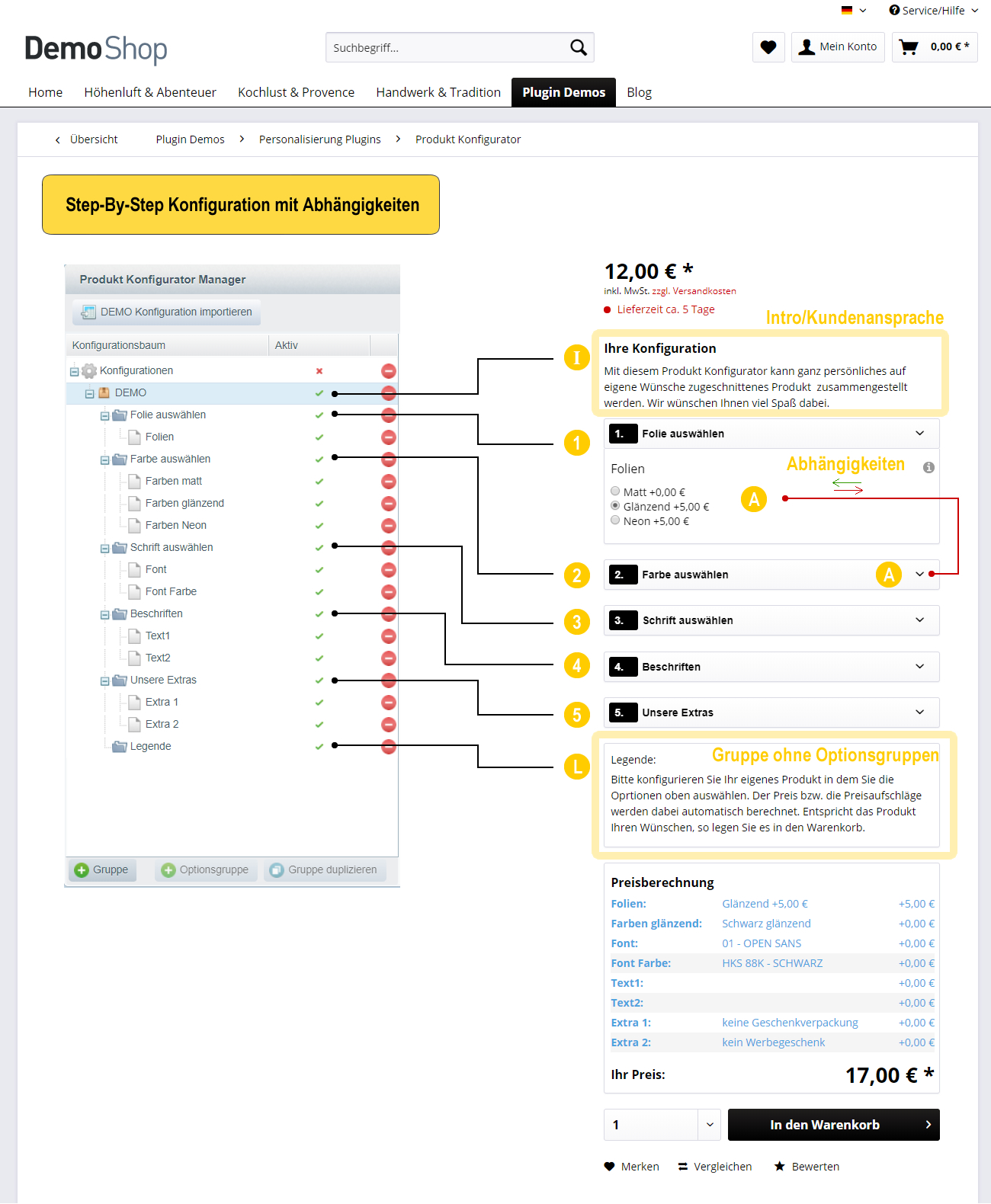 Mit diesem Produkt Konfigurator kann ein ganz persönliches auf eigene Wünsche zugeschnittenes Produkt zusammengestellt werden. Der Konfigurator berücksichtigt auch die Preisstaffelung, falls im Artikel angegeben. Wir wünschen viel Spaß beim Testen. Weitere Infos finden Sie in unserem Produkt Konfigurator Handbuch.